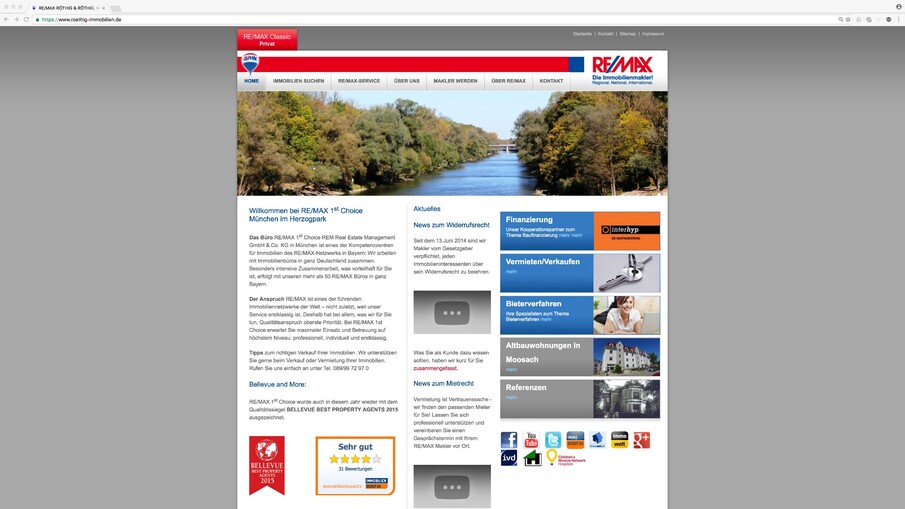 Für die RE/MAX-Niederlassung München-Herzogpark entwickelte FIGGE+SCHUSTER einen komplett neuen Online- und Imageauftritt. Um sich unter den zahlreichen RE/MAX-Partnern dabei möglichst positiv und seriös abzuheben, waren diverse Maßnahmen im Online-Bereich notwendig. In zwei Workshops wurden dazu vorab Fragen zu grundlegenden Bereichen wie Unternehmen, Unternehmenspositionierung, Strategie, Mitbewerber, Benchmarks, Zielgruppe, Marketing und Corporate Design thematisiert. Die jeweiligen Ergebnisse und Erkenntnisse bildeten eine wesentliche Grundlage für die Neukonzeption von Person, Marke und Online-Auftritt.